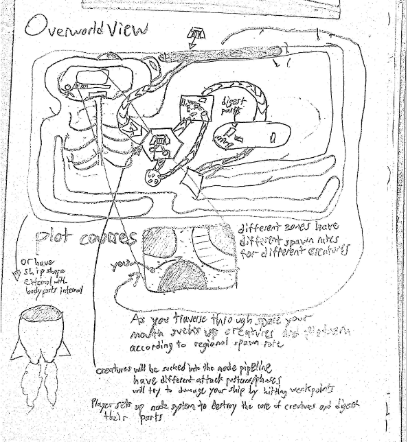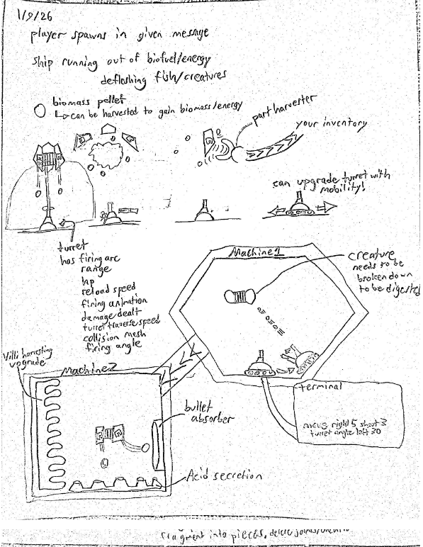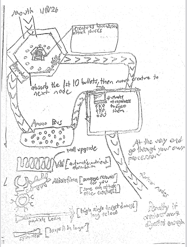 On the first day, we discussed what kind of game we wanted to make. The announced theme was "Repurposed" and I originally was intending to stick mostly to game design and writing. Banado suggested, gameplaywise, a factory style bullet hell automation or a world war two squad commander. I went with the former and you can see in the initial concept art I made the lingering influence of the first game I worked on. I understood the factory system as an analogy for a digestive system (thanks ville kallio) So you are inside of this organism and can rearrange its digestive organs to form a digestive tract. You swallow microorganisms and break them down for parts, repurposing them to expand the metabolic throughput of the machine or some other arcane end.