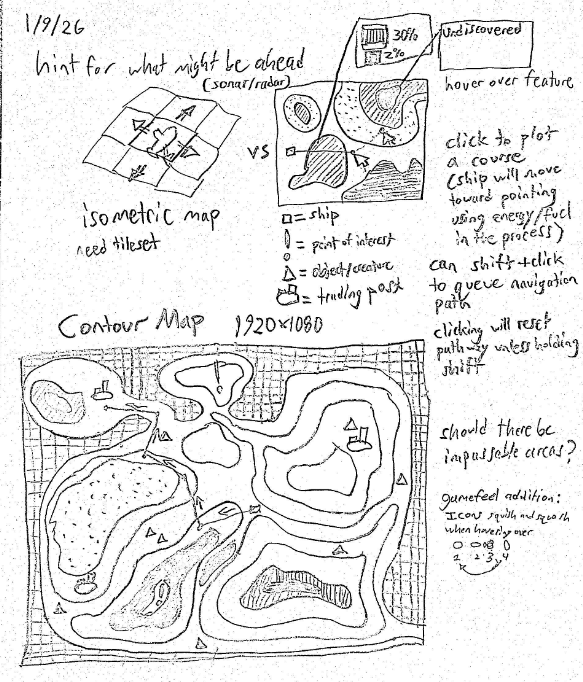 On the 13th I sketched some icons for the nodes, achievements, and features of the shipyard/programming UI. I also had an idea to implement a fog of war for the map which is what the unimplemented sonar was for. That would have taken extra devtime so we had to cut it. If I were to inmplement it now I'd do some kind of masking operation where a black rectangle was overlayed on the map and there is a circle around the ship that unmasks the black rectangle. To retain visibility of paths you've already traveled I could make another layer that gets painted on to create an "additive mask." While I'm not sure which exact methods to call, that's my initial idea.