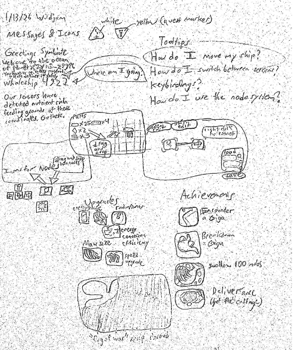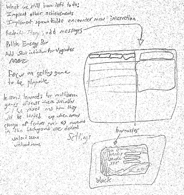 There is an undated concept art page of the start menu which looks much closer to the final product. I'm quite proud of the start menu as it communicates the oceanic whale theme very effectively and I coded it solo. I also fleshed out the message system.