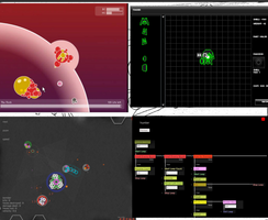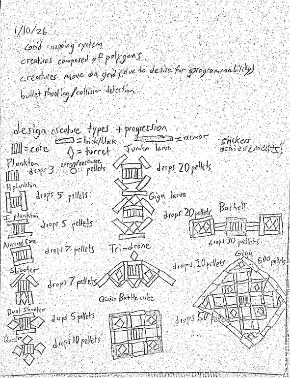 I was already thinking about what the ingested microorganisms would look like and play like. I thought of Shellcore Command. It's a game where you have a 2D pixel core and can surround it with parts (that have various abilities) in a ship editor and scavenge parts from destroyed other shellcores. Banado ended up implementing the ship designer and shooting/collision/movement logic. If the core is destroyed the rest of the organism explodes into little parts. We didn't end up implementing any animation for that. All of these designed creatures made it into the final game with minor variation. The pellet dropping mechanic was not implemented and no special armor brick type was implemented. It wouldn't be too hard to implement though: just duplicate the regular brick, give it more HP, and change the sprite.