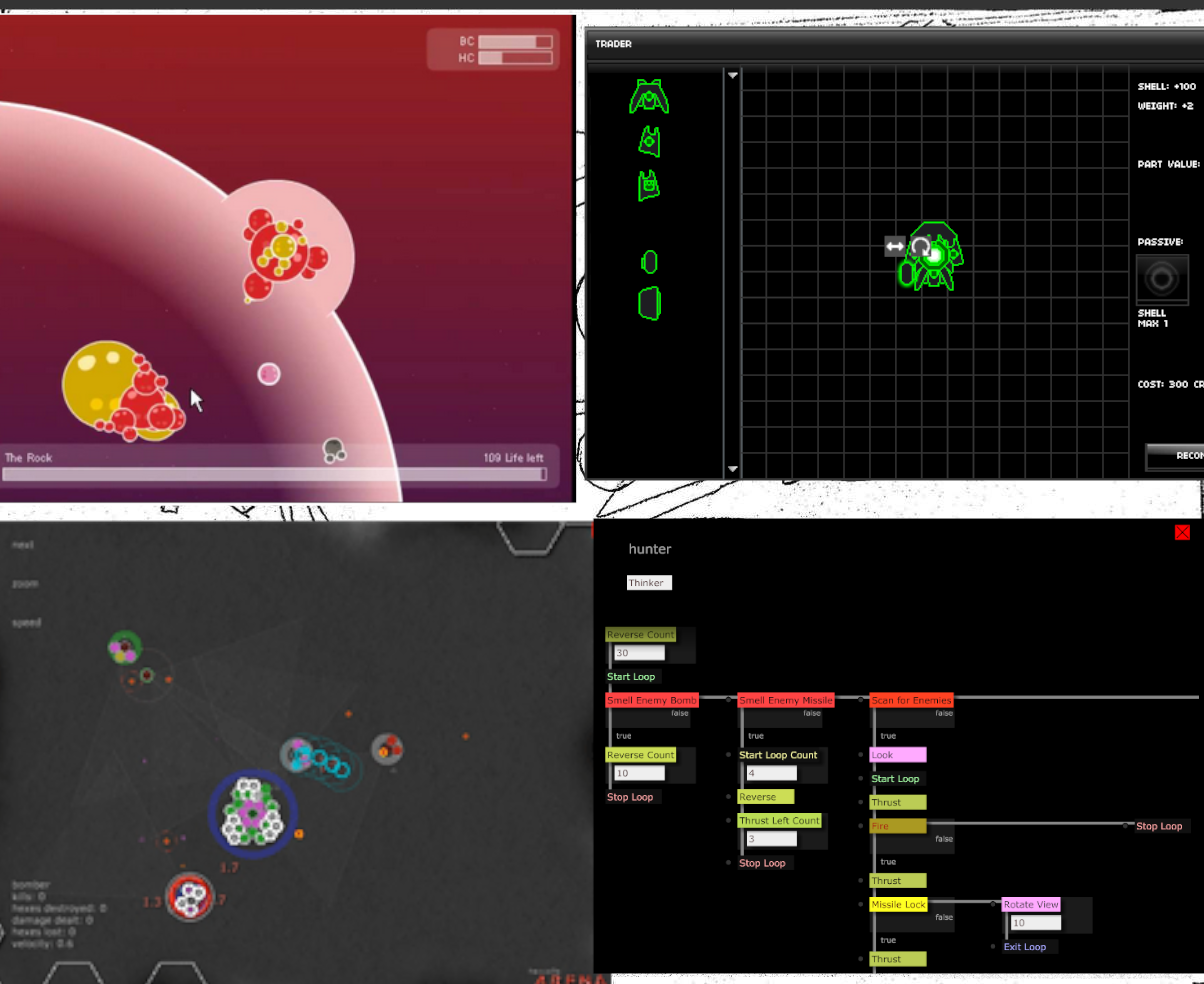 Most of these games have quite detailed part customization (except for Deepolis) that meaningfully affect gameplay. Hexcelle Arena lets you tinker with creature behavior AI and was my first and best introduction to loop based programming in middle school. If you choose to play it remember to hold space while click dragging to move around in the program or "thought" editor.