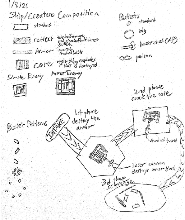So from the start we overscoped and the digestion chamber mechanic ended up being scrapped. Only a single bullet type, turret type, brick type with just horizontal or vertical position, and core type made it into the game. I planned for a twist final boss ending where the player would get sucked into their own digestion factory system to see if they could make it through their own creation. Lysing the cores/parts of swallowed bioships would have given a percent chance to leave parts floating that could be salvaged and reused (repurposed even) for ships of your own creation.